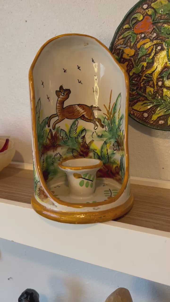 Candle Alcove: This candle alcove depicts a wild nature scene with flying birds and a deer running, calling in the aspect of Artemis Elaphia, the goddess of hunting deer, where she was celebrated with an ancient Greek festival with honeyed cakes in the shape of stags. The candle calls in the aspect of Artemis Phosphorus, who guides the way through the wilderness with her torches. It is made of ceramic and hand-painted in Spain, originally for the Ethan Allen furniture company. It includes a candle holder in the center that illuminates the nature scene painted on the backsplash. Around the candle holder is a small amount of space to tuck in additional offerings to Artemis such as stones, arrow heads, and other small trinkets. This piece measures 8x6.5x4.5 inches; the candle holder can house candles that are 1-1.75 inches wide.