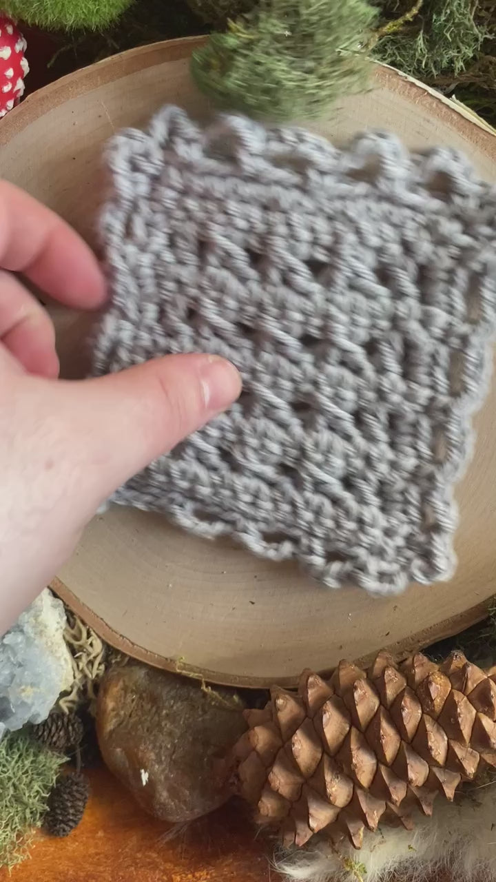 The last offering in these kits is a cloth that was crocheted by Mama Trickster, the mother of your local trickster spirits, as she delved into a hobby she enjoys dearly to share that joy with you all. Each one is made of soft yarn in different colors and patterns that can be used to gently wash your face; please note that the yarn color may fade with use as is its nature. Each Frilled variety measures 4.5x4.5 inches, while Clean Cut variety measures 3.5-3.75x3.75 inches.